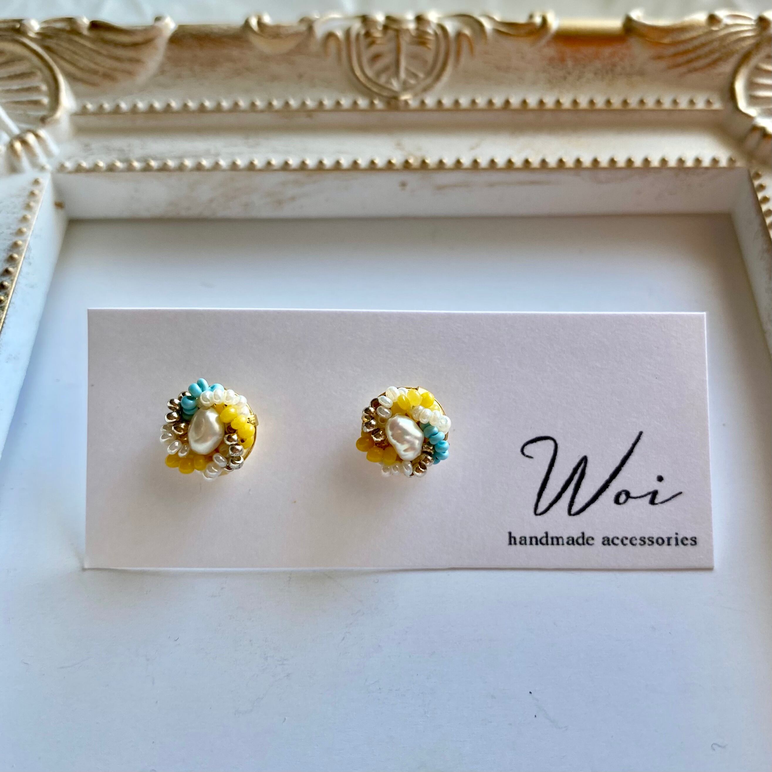 柔らかい色合いのイエローとスカイブルーにホワイト、シルバーが合わさりとことん優しい印象に。