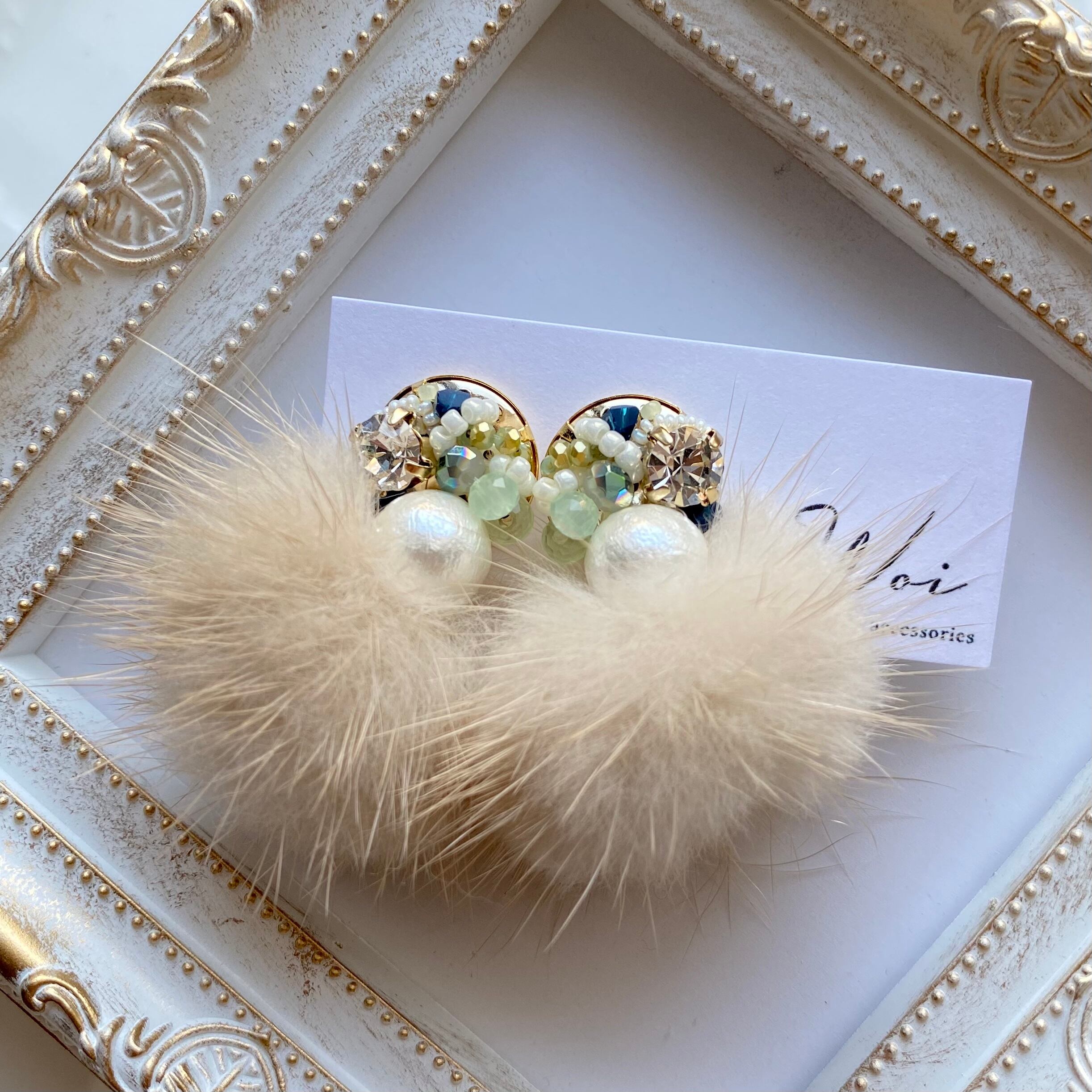 優しい色合いにネイビーを合わせて可愛すぎずお洒落なミンクファーのイヤリング