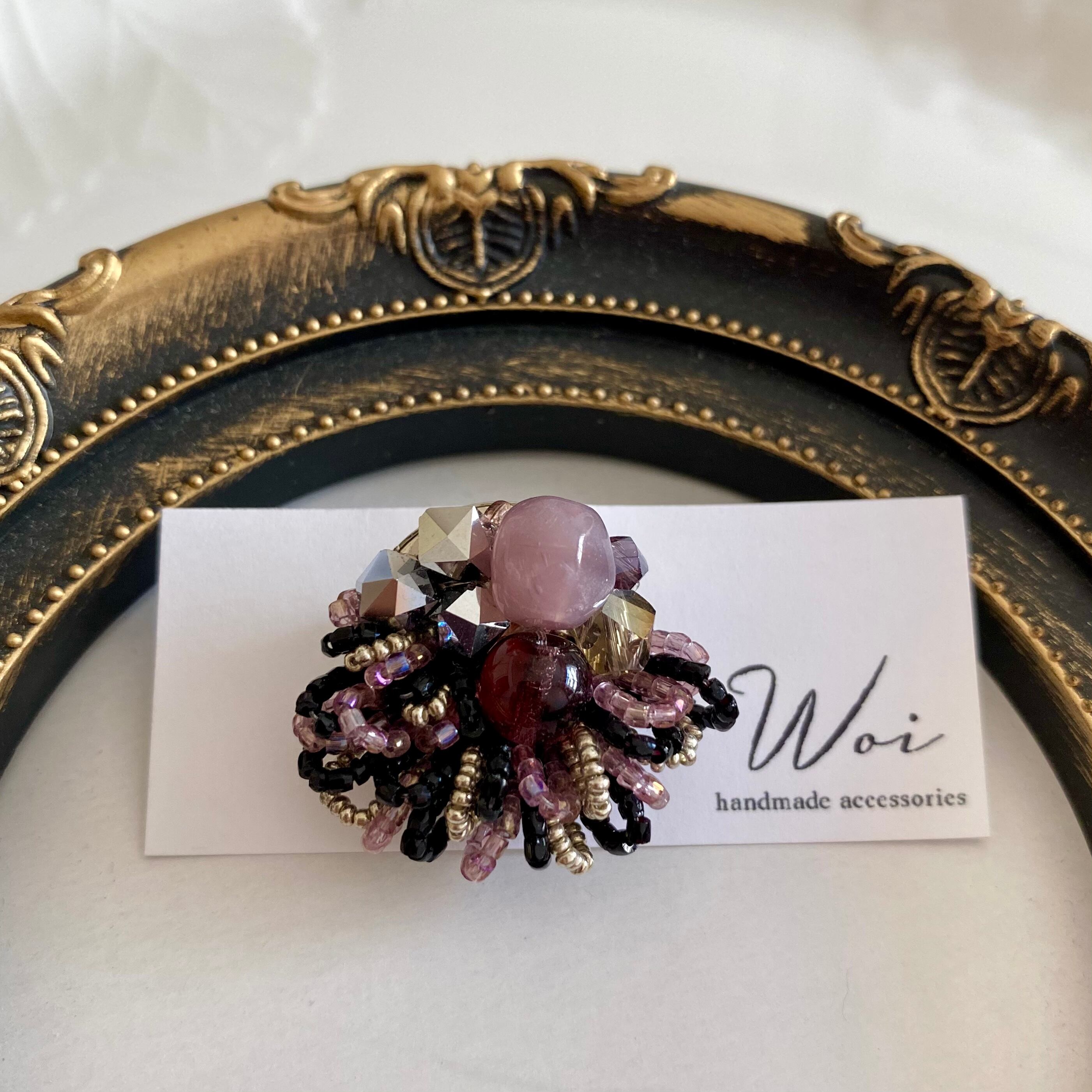 天然石のアメジストにパープル、ブラック、シルバーのビーズを沢山使った立体感のあるデザイン