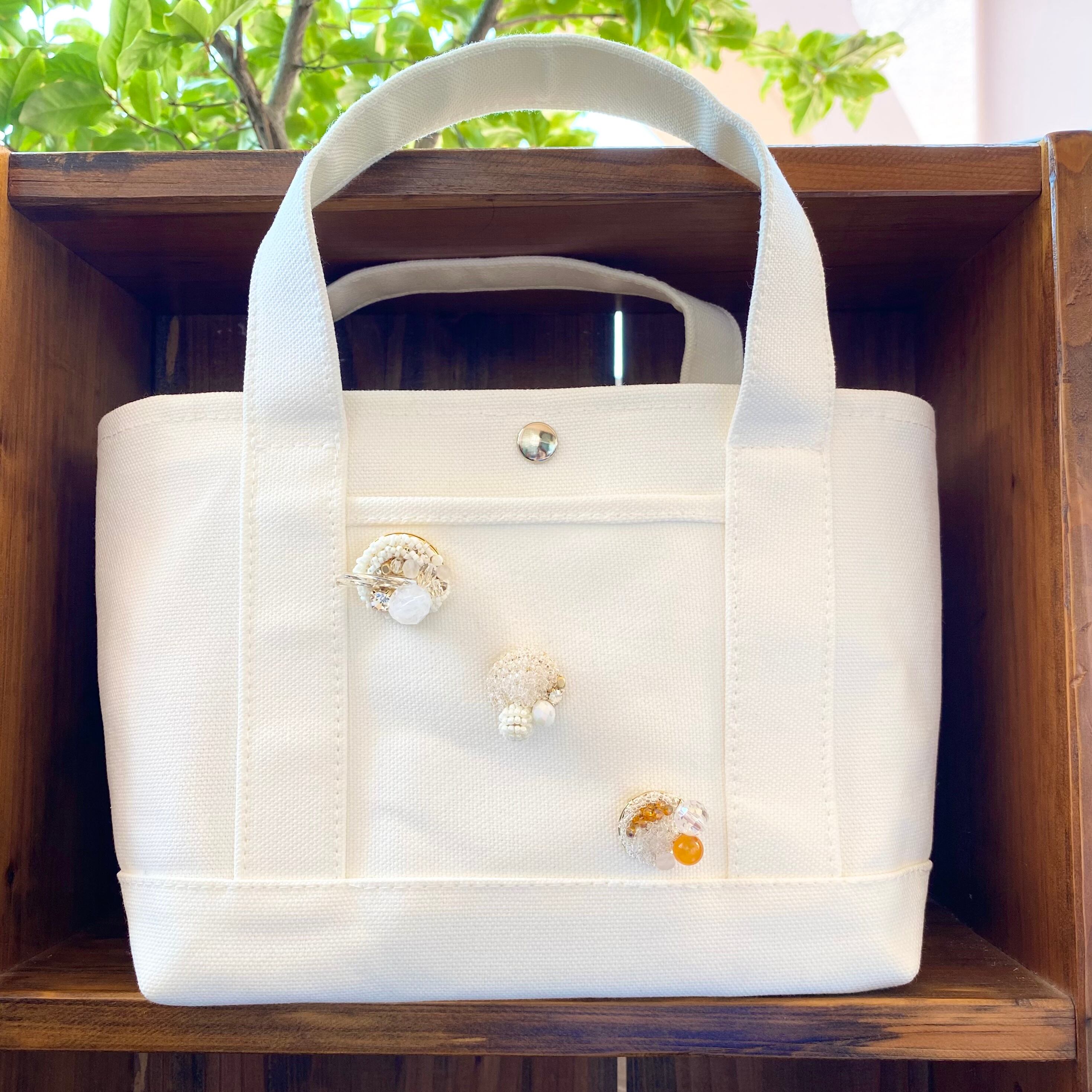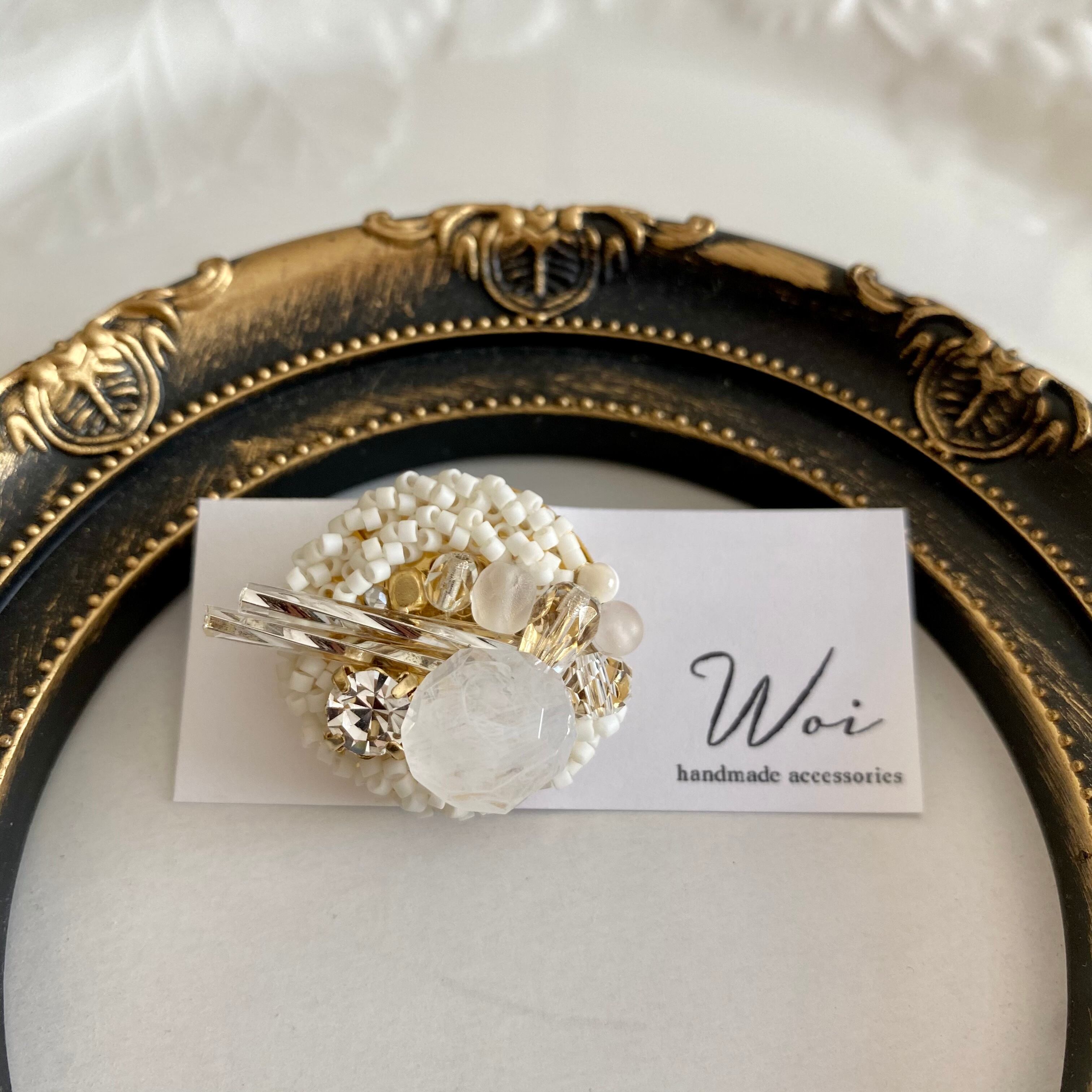 くすみのない白がシンプルになりすぎないように数種類のビーズを合わせて上品でインパクトのある印象に仕上げました。