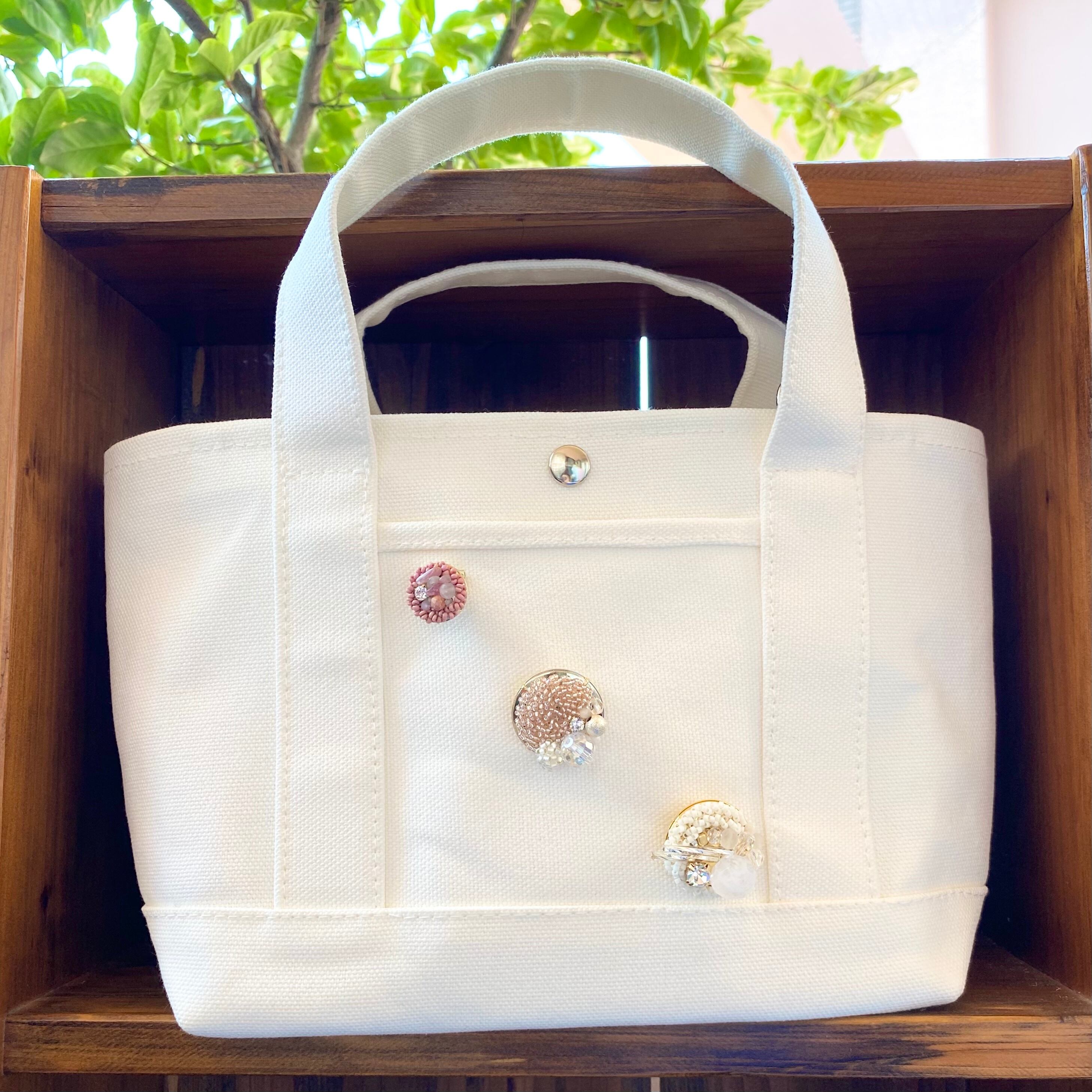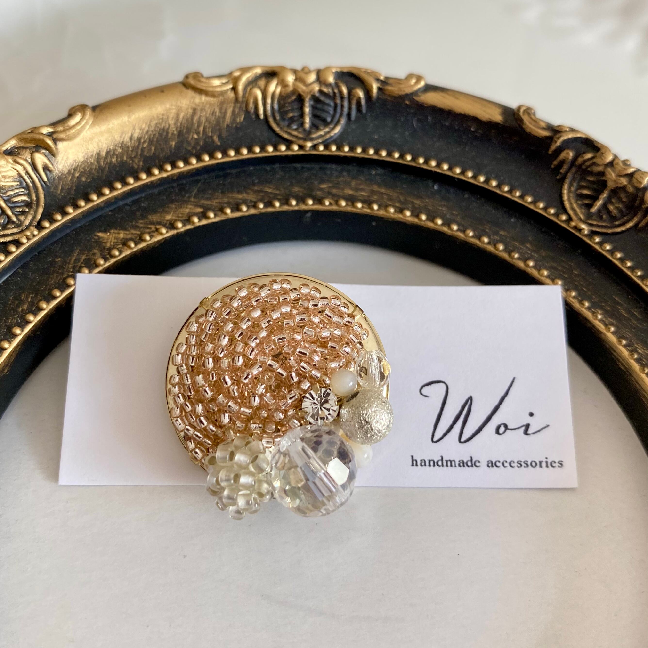 優しい色味のベージュをベースに、ガラスビーズやマザーオブパール、粒玉を編み込みました。