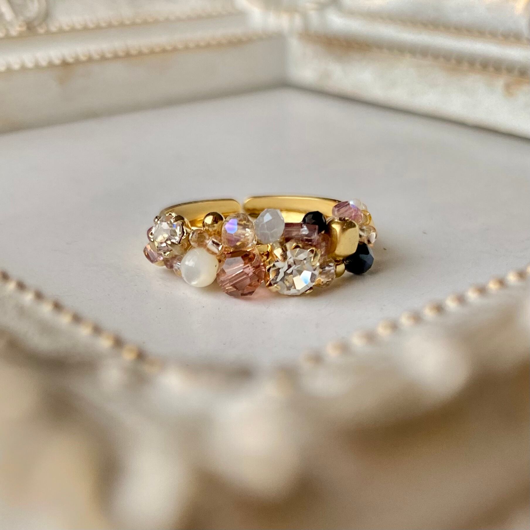 淡いパープルが女性らしい✨ スワロフスキーやマザーオブパールを使っています。