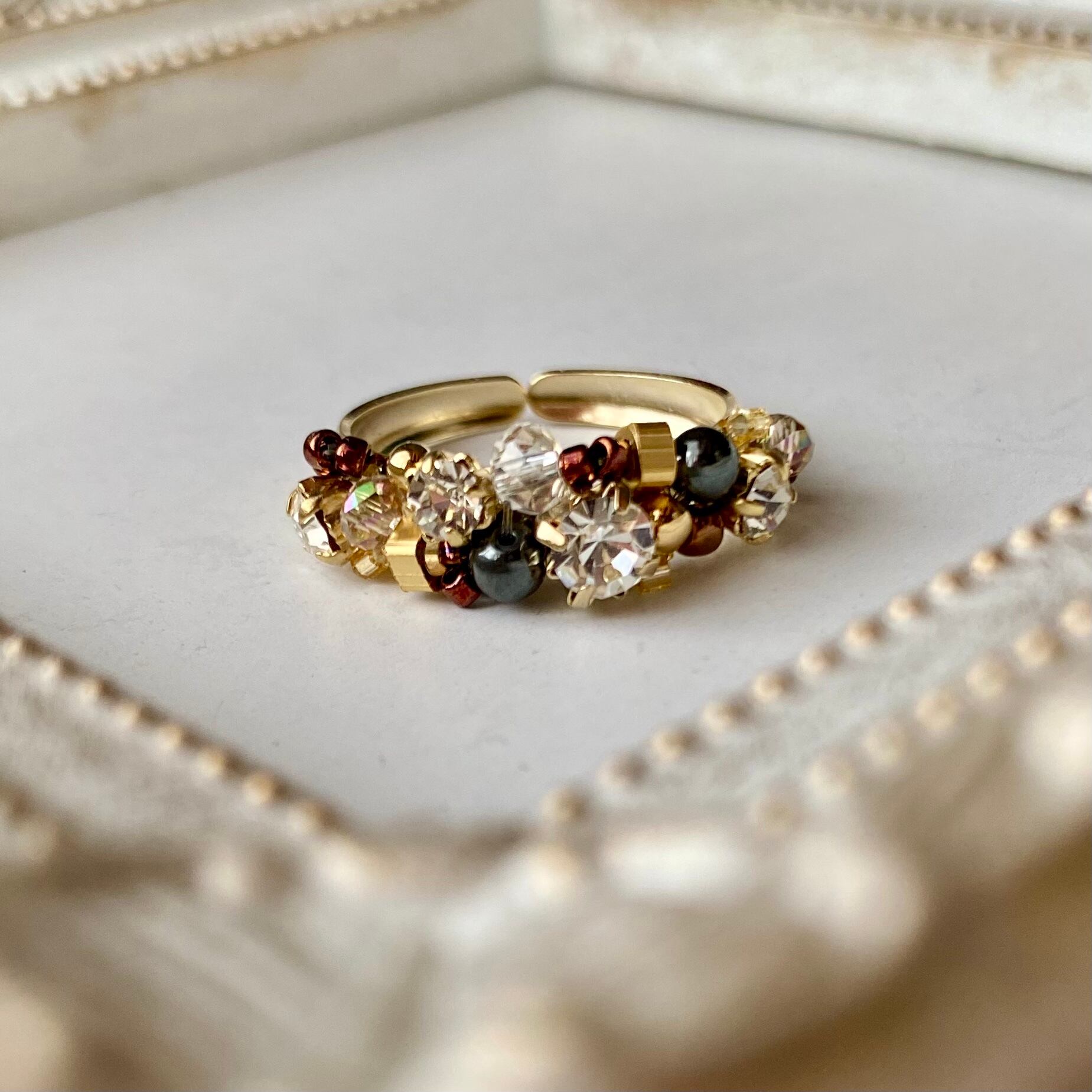 色合いは落ち着いていますが、キラキラのストーンをふんだんに使っているので光り方がとても綺麗です