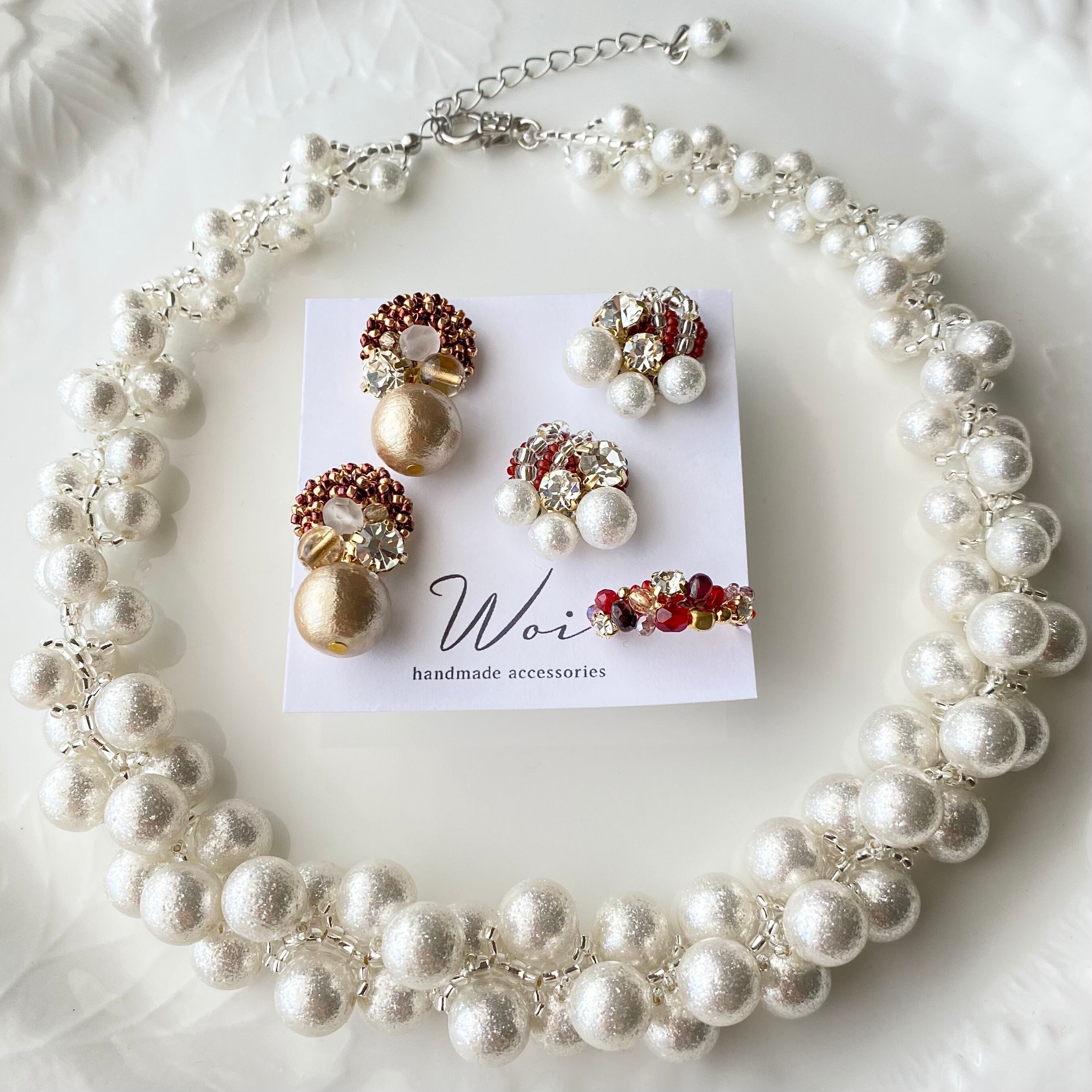 パールネックレスとイヤリング セット 秋色イヤリング 指輪(レッド系) 3点です。